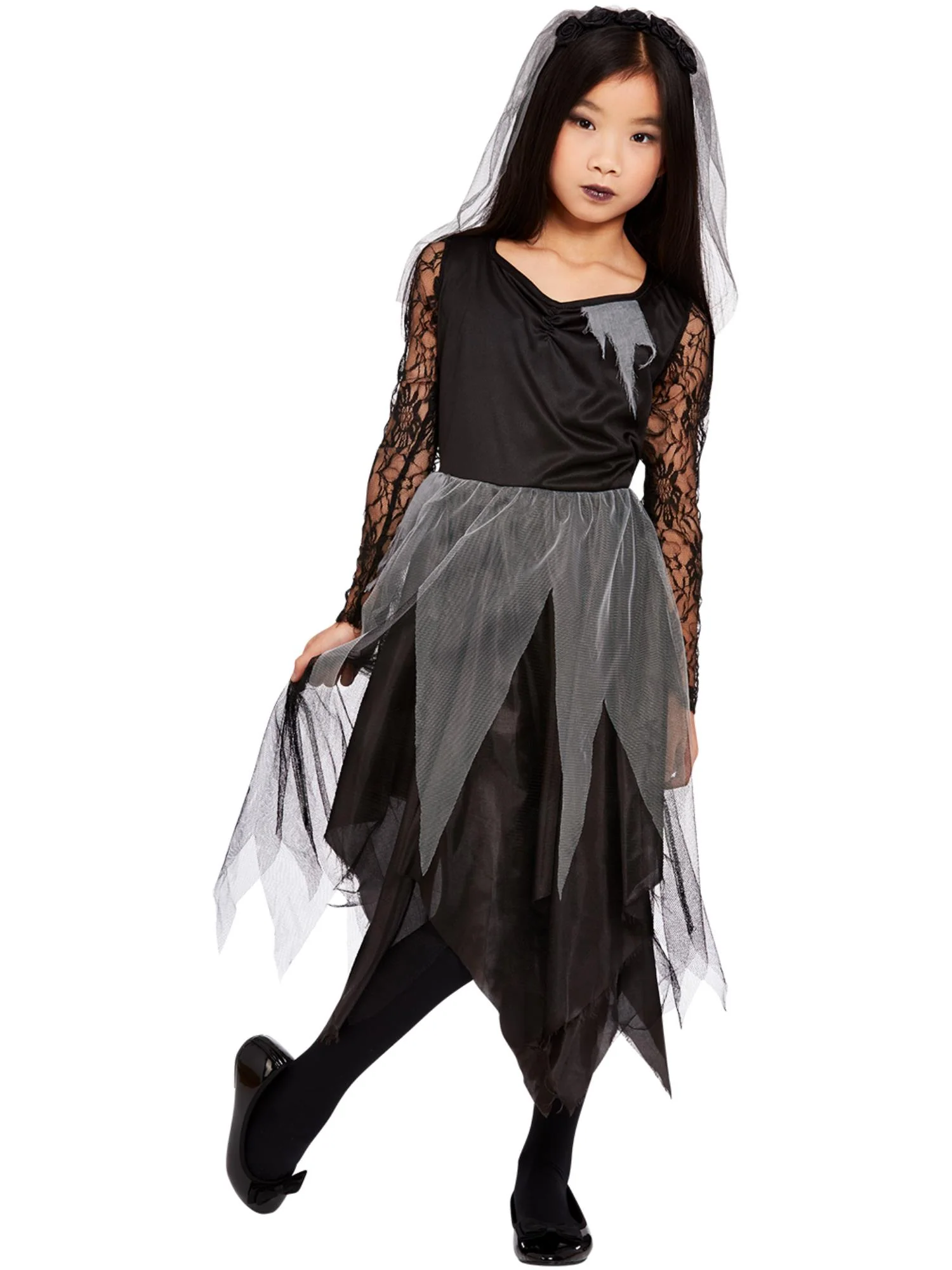 Girls Black Graveyard Bride Costume, Black, with Dress and Veiled Headband.